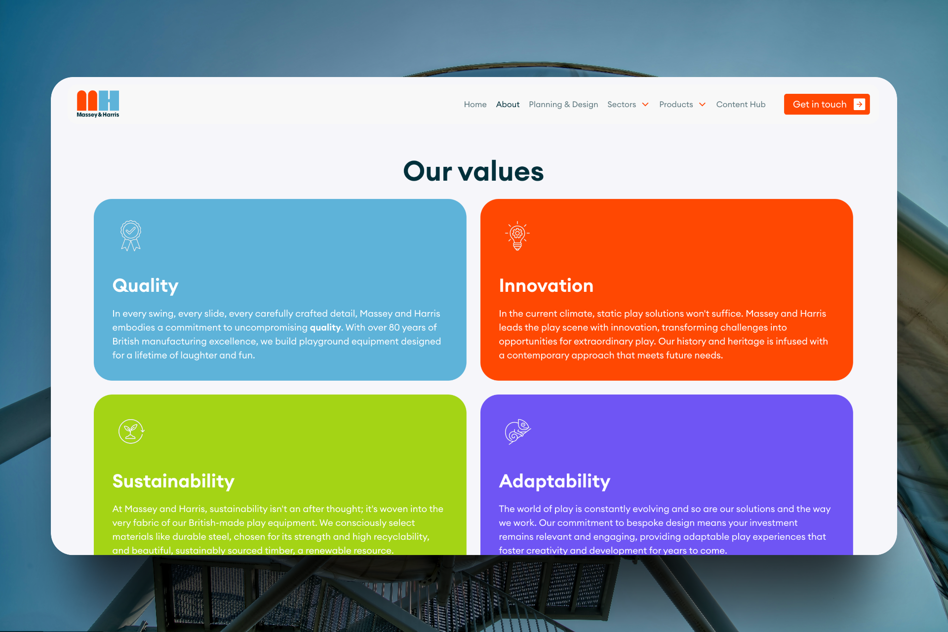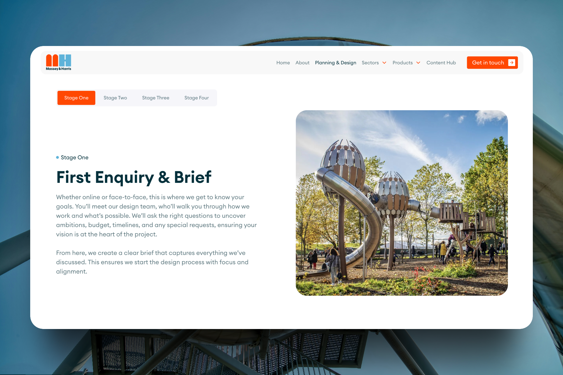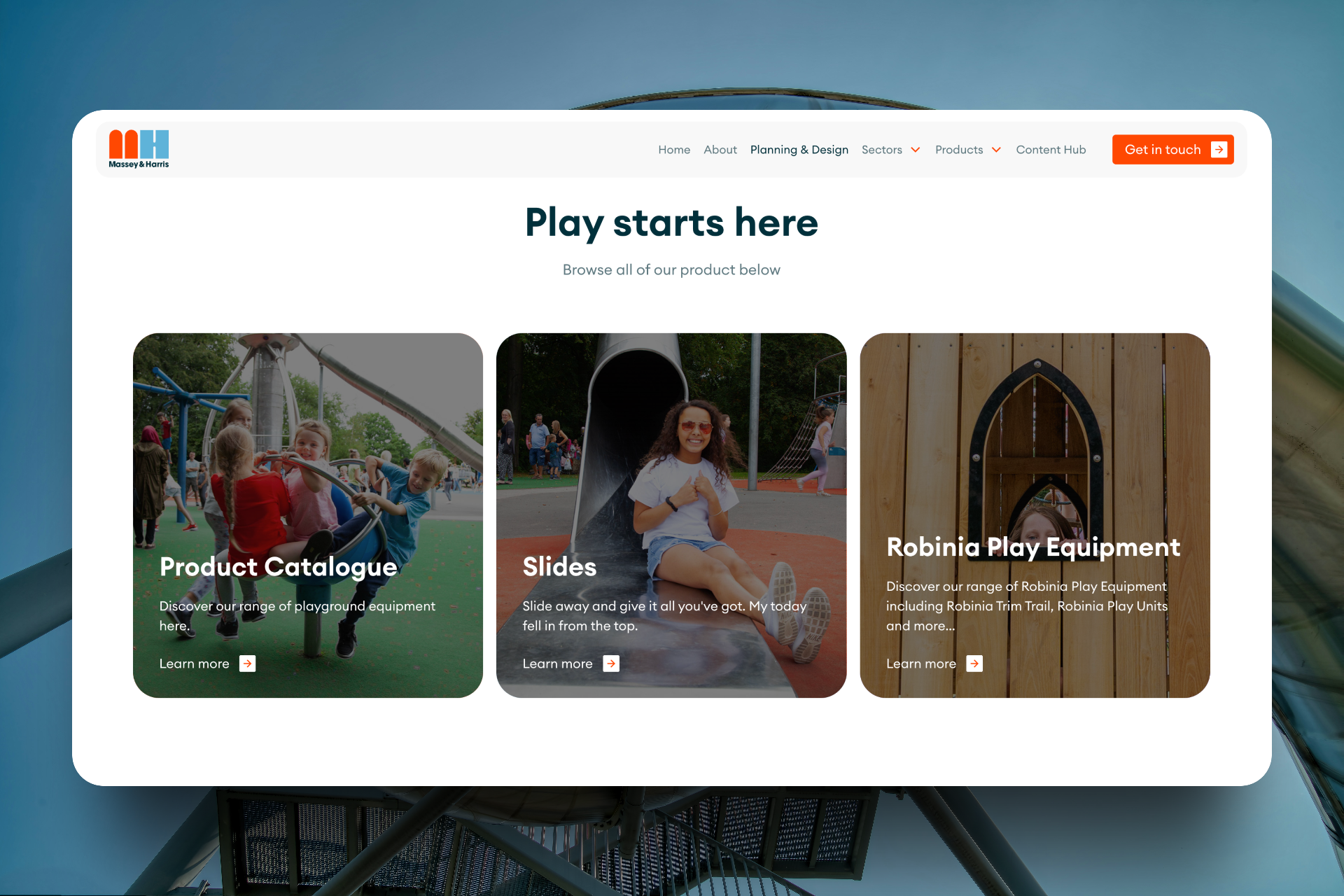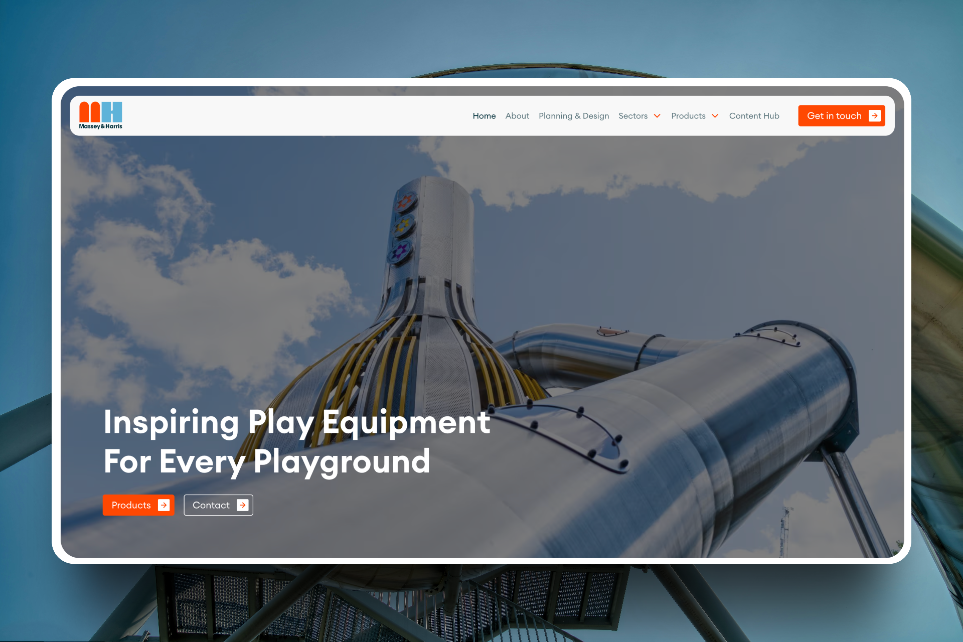 We worked with Massey and Harris, specialists in stainless steel playground equipment, to transform their online presence. Although they’ve been established for over 30 years, their website wasn’t reflecting the scale of their expertise or the innovative projects they deliver. Our goal was to create a modern, clean platform that showcases their bespoke products, inspires councils and landscape architects with standout project visuals, and provides the resources their audiences need.